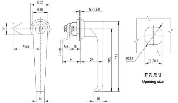材料: 锌合金锁壳、手柄和锁芯,碳钢钢 栓和螺母。